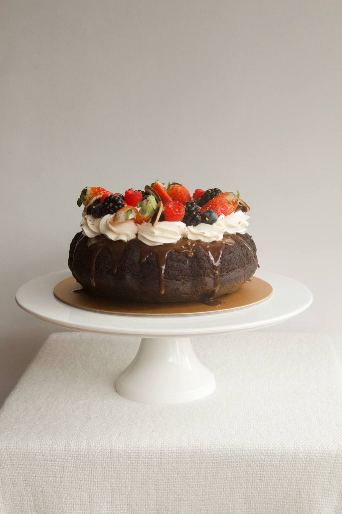A decadent chocolate orange bundt cake topped with chocolate drip, yuzu buttercream and plenty of berries